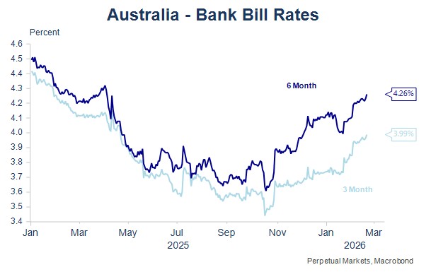 - US stock and bond markets were again relatively volatile, reflecting the market pricing the likely impact of AI on employment and business models of certain firms over the long-term. Software as a service companies’ share prices were particularly hard hit and a number of these companies have already announced hiring freezes or significant layoffs. Overall US ten-year bond yields ended the month 29bps lower, while the US market is now pricing three interest rate cuts by mid-2027. It seems that the longer end of the bond market is currently prepared to look well ahead for the impact of AI on employment. What happens directionally in US bonds, usually is reflected in Australian bond yields too. The Australian 10-year bond yield dropped 15bps over February and fell a further 8bps on the open today.